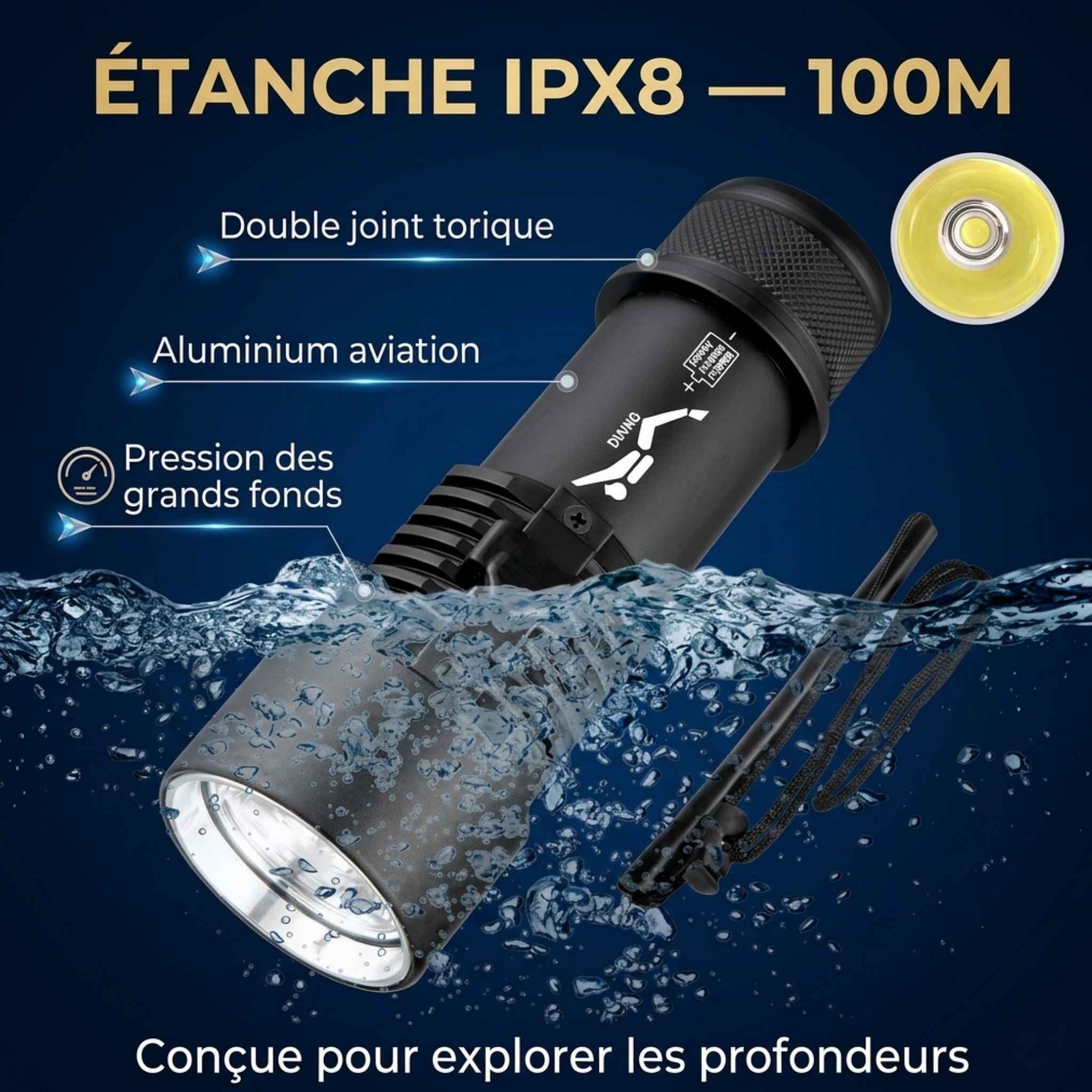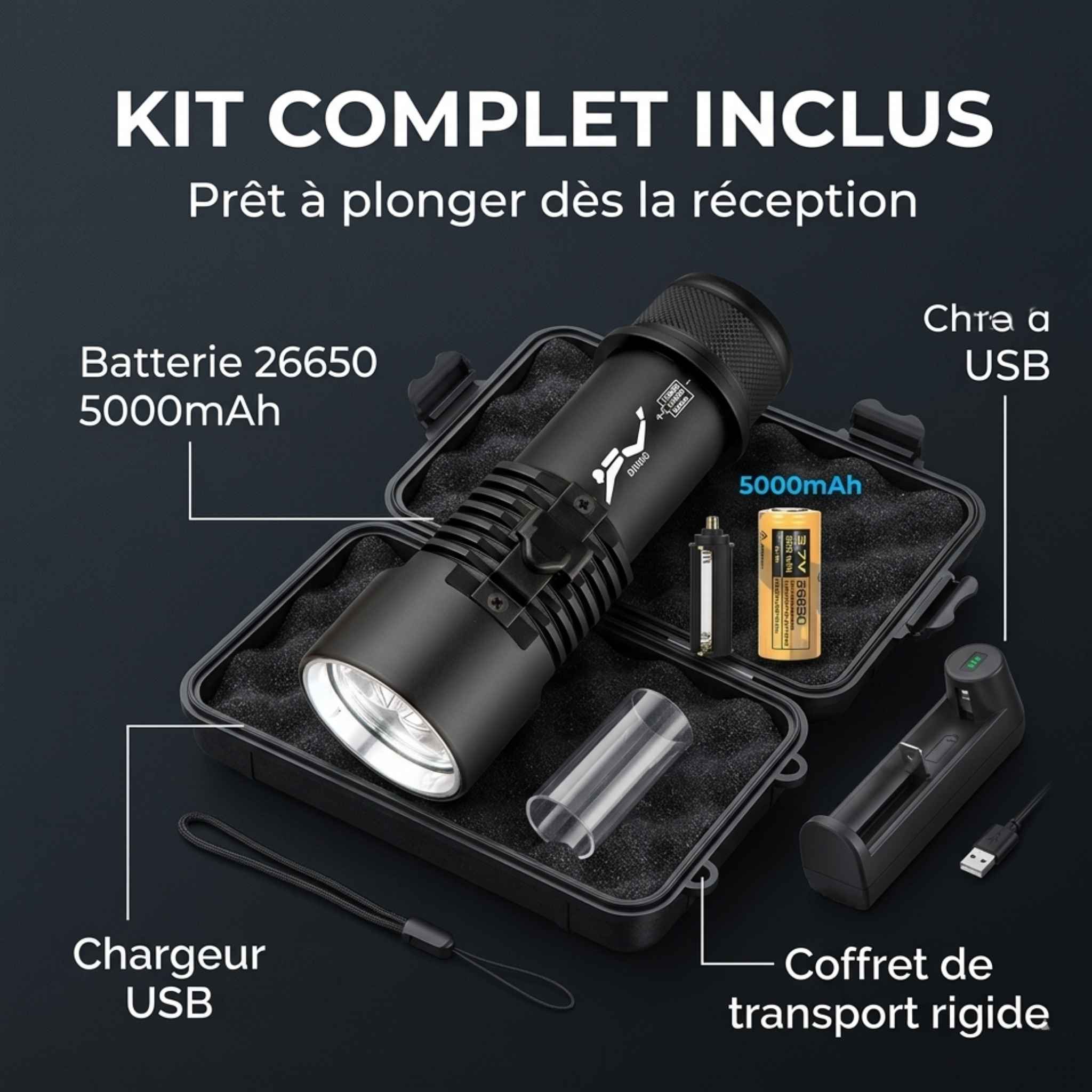 Lampe XHP70 + batterie 26650 5000 mAh + chargeur USB + dragonne + coffret rigide. Kit complet prêt à plonger dès réception.